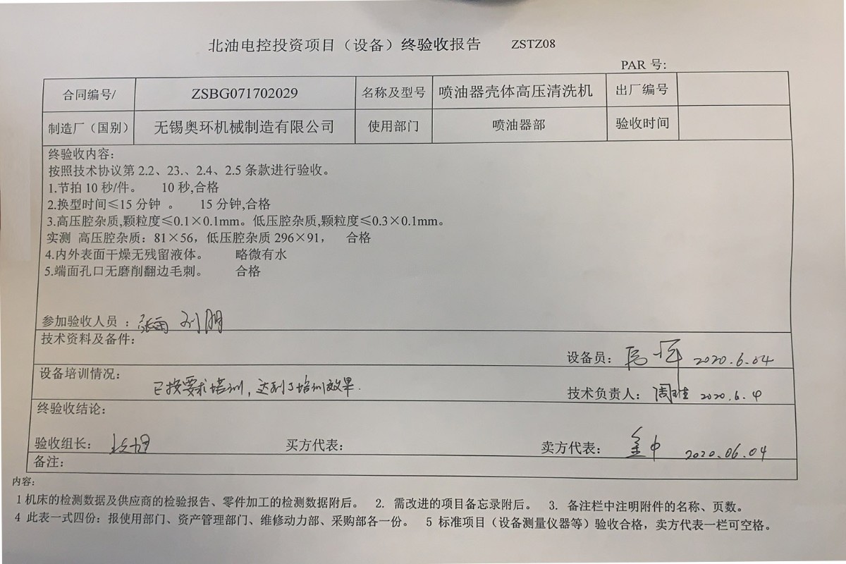 日前,我司為北油電控燃油噴射系統(天津)有限公司定制的500bar噴油器殼體高壓清洗去毛刺專機順利交付。其中高壓腔雜質要求顆粒度≤0.1?0.1mm,實測86?56;低壓腔雜質要求顆粒度≤0.3?0.1mm,實測296?91;端面孔口用100倍放大鏡查看無磨削翻邊毛刺,所有指標一次性驗收合格,順利交付使用。
