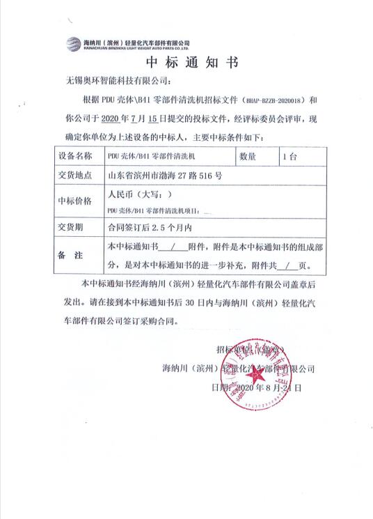 日前,我司中標渤海汽車集團海納川(濱州)輕量化汽車部件有限公司PDU殼體/B41零部件清洗機項目。